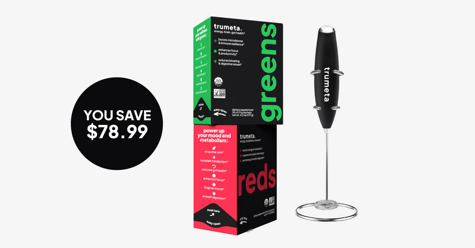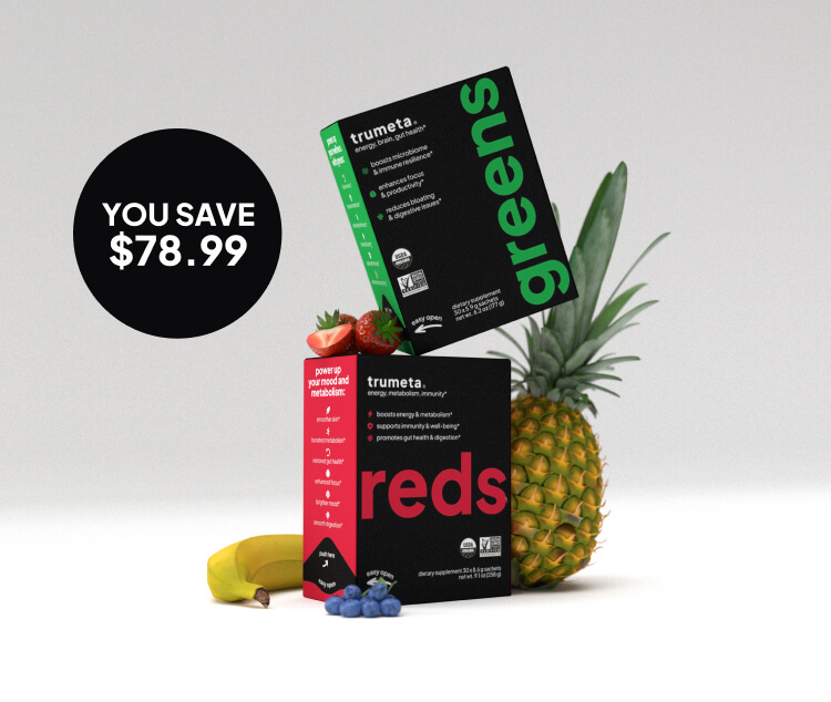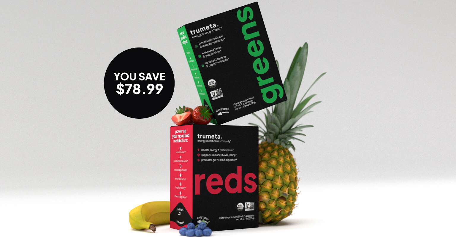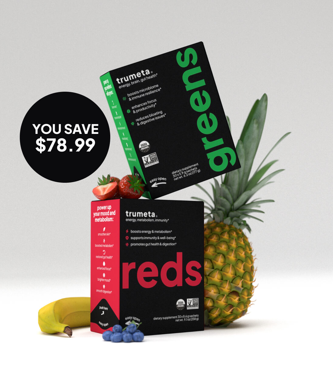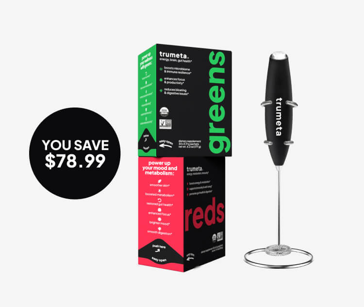 Experience health-boosting greens and reds powders bundle from Trumeta. This metabolic blend promotes a healthy gut, strengthens immunity, and provides energy. Get premium nutrition conveniently.