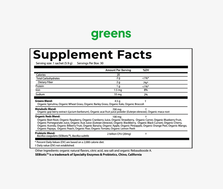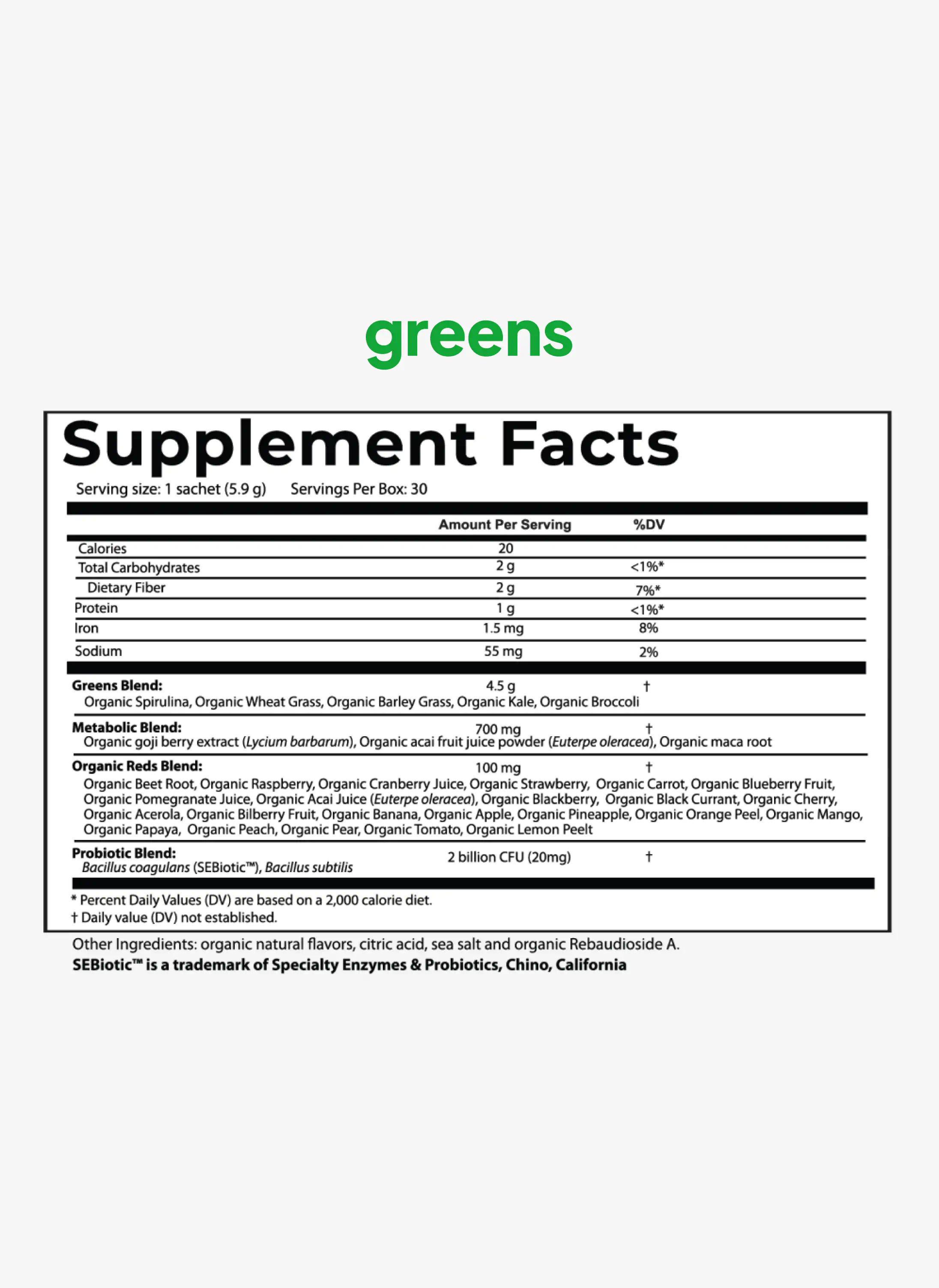 Our Greens powder contains our special probiotic blend for improved gut and immune health. It also features organic greens and veggies to support healthy muscles, bones, skin, and digestion.