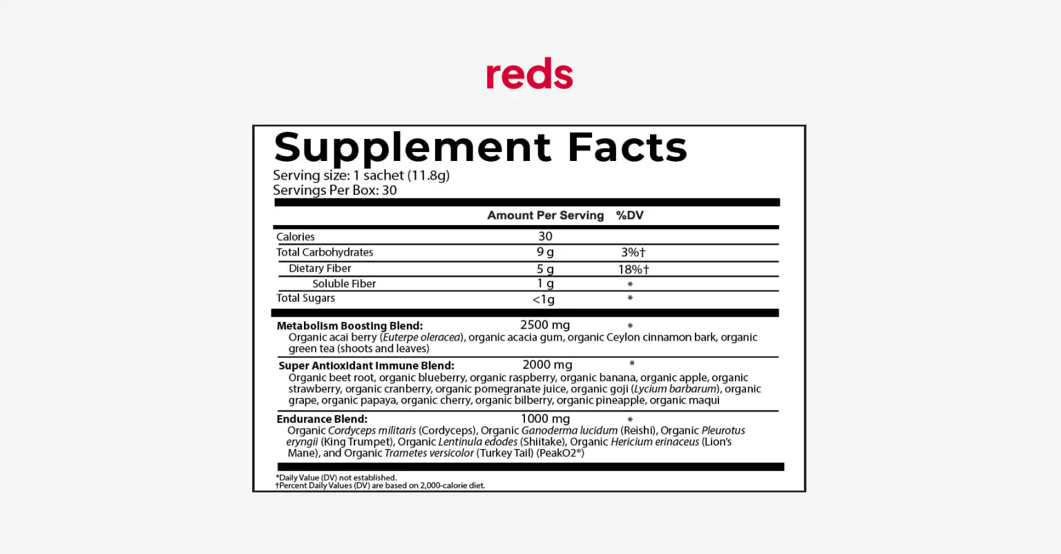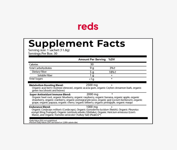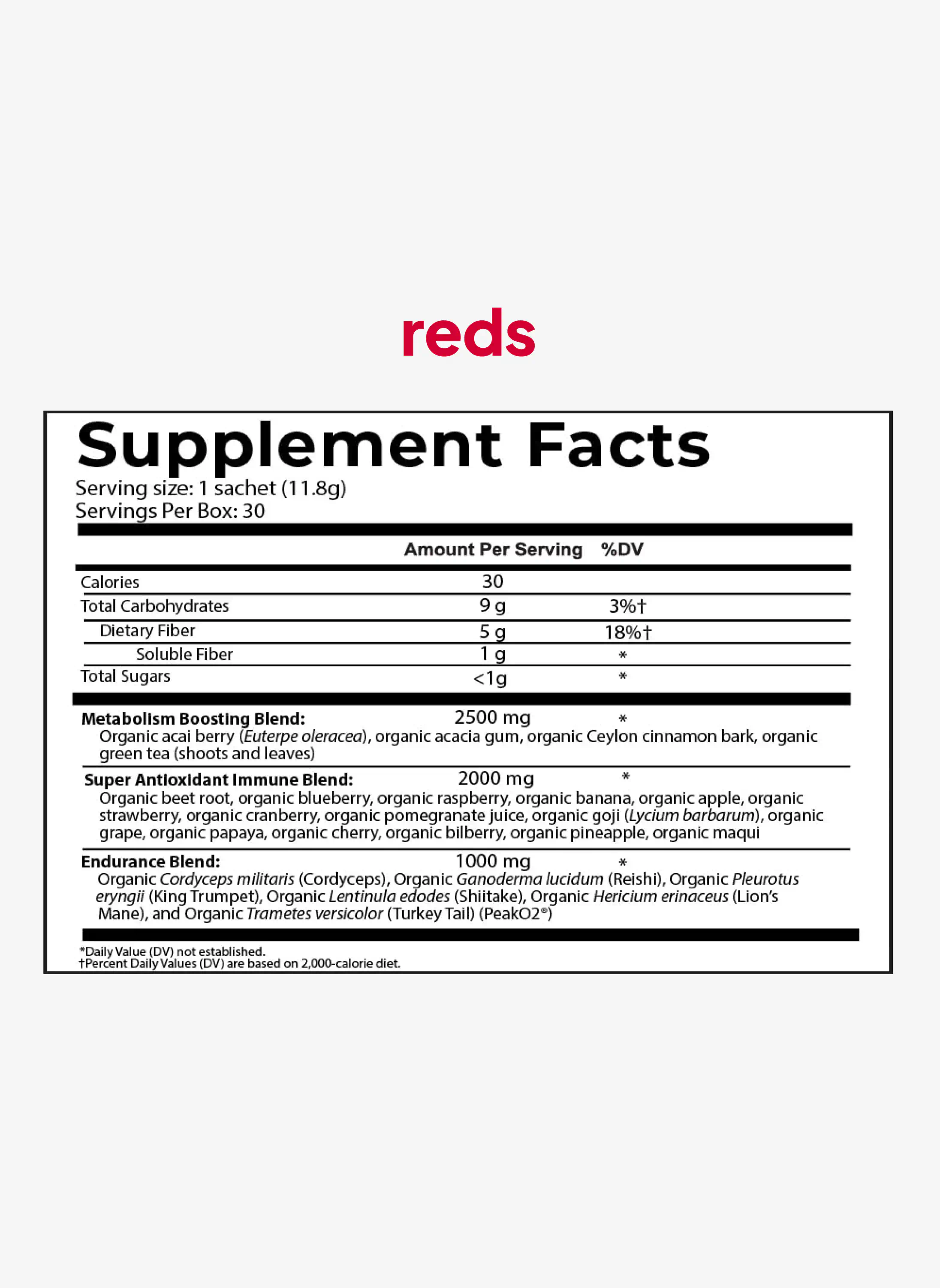Our Reds powder contains more organic fruits filled with antioxidants. It also features our unique mushroom blend for enhanced endurance and memory.